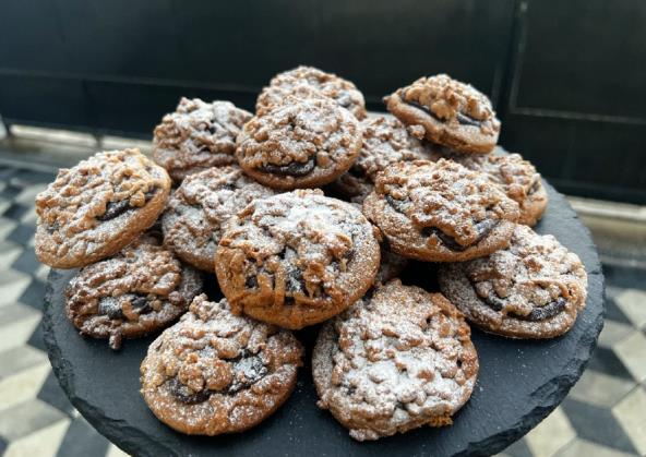 Puter pomešajte sa jajima i šećerom, pa umutite da dobijete penastu smesu. Dodajte brašno, kakao prah i prašak za pecivo, pa zamesite glatko testo. Odvojite jedan deo testa, zamotajte ga u foliju i stavite u zamrzivač na 20 minuta. Za fil u šerpici pomešajte mleko i šećer, dodajte brašno i kakao, sve sjedinite da ne bude grudvica i zagrevajte na umernoj vatri uz konstantno mešanje dok se ne zgusne. Dok je fil još vruć dodajte izlomljenu čokoladu i lepo sjedinite. Drugu polovinu testa razvucite oklagijom na debljinu oko pola centimetra, pa čašom ili modlom vadite kolačiće. Na svaki stavite kašičicu fila, pa odozgo narendajte testo iz zamrzivača. Ređajte ih u pleh obložen papirom za pečenje i pecite na 200 stepeni oko 20 minuta. Pre služenja ih pospite šećerom u prahu.