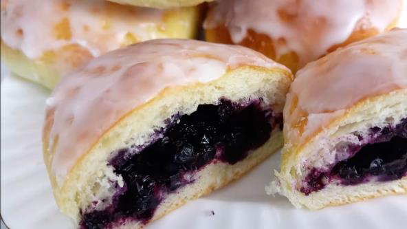 Pomešajte borovnice sa šećerom i skrobom. Stavite testo na sto i mesite nekoliko minuta. Zatim podeliti na 8 jufkica. Poravnajte rukom deo testa i stavite veliku kašiku borovnica na sredinu. Zalepite ivice testa zajedno kao kada pravite knedle. Oblikujte pogačice. Odložite na pleh prekriven papirom za pečenje, ne zaboravite da ostavite razmake između. Pokrijte krpom i ostavite 30 minuta. Premažite mešavinom malo mleka i ulja. Pecite u rerni zagrejanoj na 180°C oko 20 minuta, dok ne porumeni.
