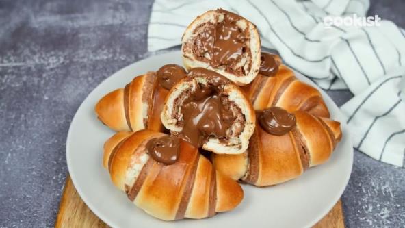 Zagrejte rernu na 180°C. U činiju sipajte brašno pa od brašna napraviti udubljenje i u njega izmrviti svež kvasac. Sipajte mleko, puter, jaje, šećer i toplu vodu. Mešajte da se kvasac rastvori. Mesite smesu rukama dok se testo ne sjedini. Mešajte dok ne postane glatko i elastično, a zatim podelite na pola. Polovinu testa pomešati sa kakaom i 15 ml mleka. Oba testa formirati u loptu i ostaviti 1 sat. I čokoladno i belo testo razvucite u pravougaonik. Položite jedan list testa na drugi i lagano pritisnite. Testo isecite na trouglove i uvaljajte u kroasane. Stavite svaku rolnu na pleh za pečenje obložen pek papirom i premažite mlekom. Pecite 20-25 minuta, ostavite da se ohladi, a zatim napunite kremom od lešnika.