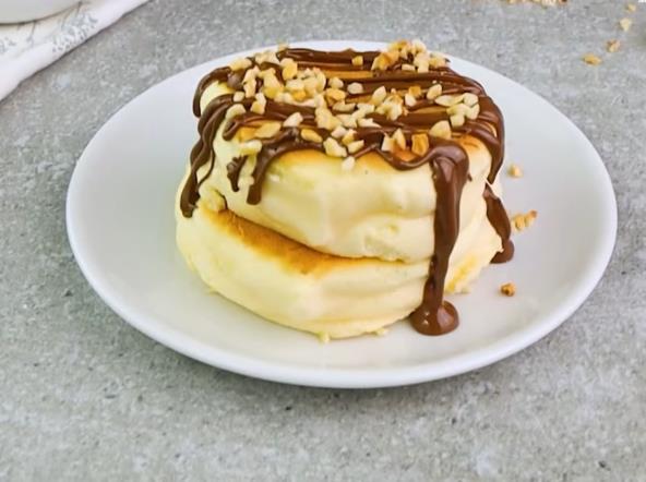 U činiju stavite žumanca, mleko, aromu vanile i brašno i mešajte dok se ne sjedine. U drugu činiju umutiti belanca i šećer. Postepeno dodajte belanca u smesu od žumanaca i mešajte špatulom. Sipajte u tiganj dve kašike smese (jednu preko druge) i sipajte malo vode u tiganj. Pokrijte i ostavite 2 minuta. Posle 2 minuta dodajte još jednu kašiku, pokrijte poklopcem i ostavite da se peče još 2 minuta. Skinite poklopac, okrenite palačinke i ponovo ih pokrijte poklopcem. Pecite još 3 minuta. Poslužite palačinke i ukrasite ih kremom od lešnika i zrna lešnika.