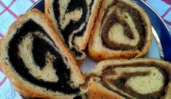 4. Testo premesimo pa nam još jednom naraste. Kad je i drugi put naraslo istresemo ga na malo pobrašnjiven sto umesimo i podelimo na dva dela. Razvijemo oklagijom pravougaonik pa dodamo mak i lepo razvučemo. Uvijemo u rolat (štrudlu) i stavimo u podmazan pleh koji možete obložiti papirom. Tako uradite i sa drugom jufkicom, nju namažete orasima i uvijete. Pokrijete folijom i krpom i ostavite da raste.
