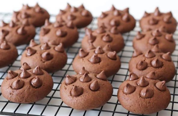 U posudi pomešajte neslani puter sobne temeprature, šećer, jaja, pa dobro umutite. Dodajte prosejano brašno i prašak za pecivo, kao i kakao. Umesite testo, pokrijte providnom folijom, pa stavite u frižider sat vremena. Nakon toga uzmite malo parče testa i oblikujte loptu, pa spljoštite rukom i stavite parče bele čokolade. Zatvorite testom i opet spljoštite rukom. Ređajte na pleh obložen pek papirom. Na vrh svakog keksa poređajte čokoladni "čips". Pecite u zagrejanoj rerni na 175°C oko 15 minuta.