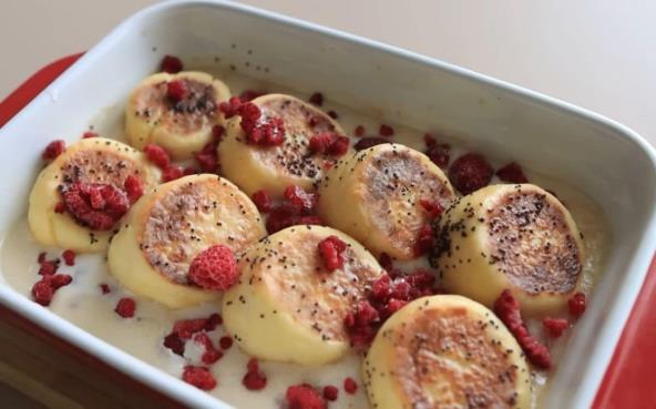 Pomešajte svež sir, žumanca, 2 kašike šećer i dobro sjedinite. Na radnu površinu stavite brašno, pa oblikujte valjak i isecite na parčiće. Ispržite sa gornje i donje strane u suvom i zagrejanom tiganju, pa poređajte u tepsiju. Mak sipajte u šerpu i prelijte vodom, pa kuvajte dok ne krene da ključa. Zatim procedite mak, vratite u posudu i dodajte pavlaku, pa sipajte mleko od kokosa i kašiku šećera. Kuvajte dok ne krene da ključa, pa prelijte preko palačinki od sira. Pecite palačinke u zagrejanoj rerni na 180°C oko 15-20 minuta. Ukrasite palačinke bobičastim voćem i služite.