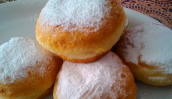 4. Narasle krofne pržiti u šerpi i stavljati ih tako da ono što vam je bilo gore okrenute sad dole u ulje. Obavezno smanjite ringlu i pržite na pola jačine. Čim ih stavite u šerpu pokrite poklopcem. Okrećite kad je donja strana pržena i sad nemojte pokrivati. Ako vam krofne imaju venac znajte da ste uspeli i da su narasle baš onako kako treba. Pospite prah šećerom zamirisan vanilom i uživajte...