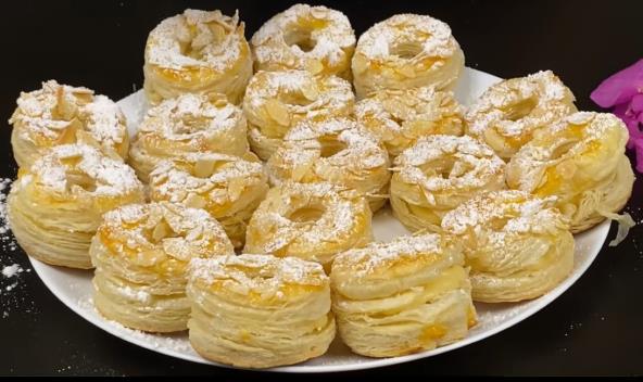 Odmrznite lisnato testo, a ako imate 2 komada od po 250 g stavite testo jedno na drugo. Ako imate jedno testo od 500 g isecite ga na dva jednaka dela, pa stavite jedno na drugo. Okruglim kalupom napravite oblike, a onda uzmite manji okrugli kalup ili nešto slično (npr. dodatak za špric za kolače). Napravite rupu na sredini, pa poređajte na pleh obložen pek papirom. Premažite umućenim žumancetom i pospite listićima badema. Pecite u zagrejanoj rerni na 180°C oko 20 minuta. U šerpu stavite koricu limuna i sipajte mleko. Kuvajte dok ne krene da ključa, a zatim izvadite koru limuna. Dodajte jaja koja ste umutili sa šećerom i skrobom, pa kuvajte dok se ne zgusne, uz neprestano mešanje. Sipajte u špric za kolače ili kesu za zamrzivač. Isecite krofne na pola, pa sipajte fil i preklopite ponovo listnatim testom koji ima badem na vrhu. Pospite šećerom u prahu ako želite.