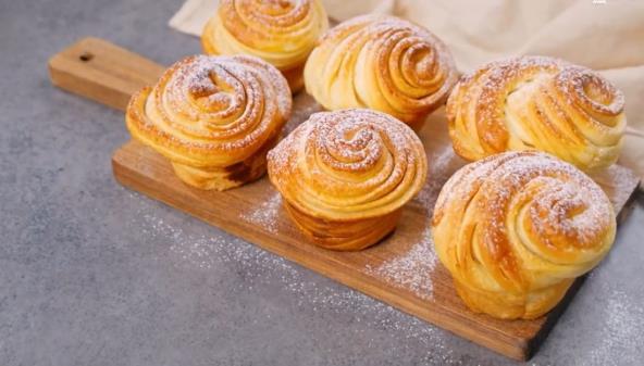 Kada je testo naraslo, izvadite ga iz posude i podelite na 6 jednakih delova pomoću strugača za testo ili noža. Uzimajte jedno po jedno testo i oklagijom ga razvucite na pobrašnjenoj podlozi. Urolajte ga i po testu premažite tanak sloj omekšanog putera. Testo čvrsto urolajte sa kratke strane da formirate cilindar. Ponovite postupak sa preostalim komadima testa, stvarajući ukupno 6 rolnica premazanih puterom.