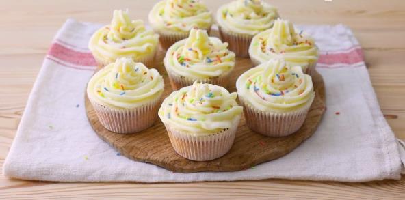 Pripremite pleh za mafine i postavite papirne korpice. Svaku korpicu napunite testom do ⅔ visine. Pecite u prethodno zagrejanoj rerni na 180°C oko 20 minuta, dok ne porumene i postanu čvrsti na dodir. Ostavite ih da se potpuno ohlade pre dekoracije.
