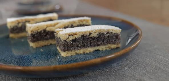 Veći deo testa rastanjite i prebacite u pleh dimenzija otprilike 33 x 29 cm, obložen papirom za pečenje. Ravnomerno rasporedite fil preko kore. Preostali deo testa izrendajte preko fila ili rastanjite pa pažljivo položite kao gornju koru. Pecite u rerni zagrejanoj na 160°C (sa ventilatorom) oko 25 minuta, dok površina ne dobije blagu zlatnu boju. Ohladite, pospite šećerom u prahu i secite na kocke.