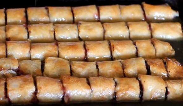 5. Svaku rolnu premazati kašikom rastopljenog margarina i seći na parčiće širine oko 3 cm a zatim na mestima gde je isečeno dodati po malo rastopljenog margarina.