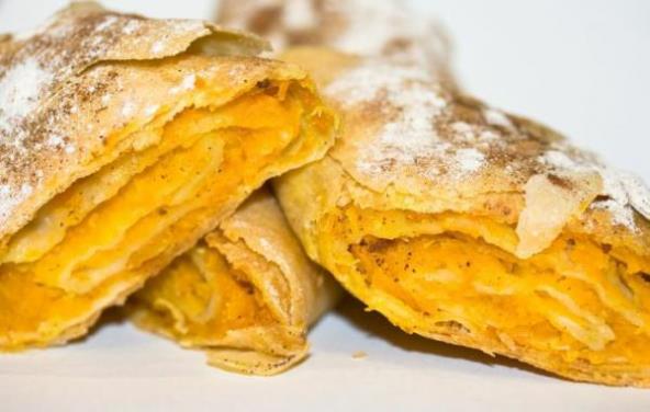 2. Uzimat po dve-tri kore, pa svaku poprskati uljem. Na treću ili četvrtu (po želji) staviti nadev od bundeve. Ponovljati postupak dok se ne utroše sve kore.