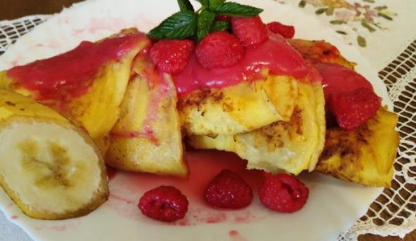 2. Teflonski tiganj podmazati uljem, pa sipati kutlaču smese i razliti po tiganju i poređati na kolutove banana. Kad se ispeče jedna strana pažljivo okrenuti drugu stranu i zapeći.