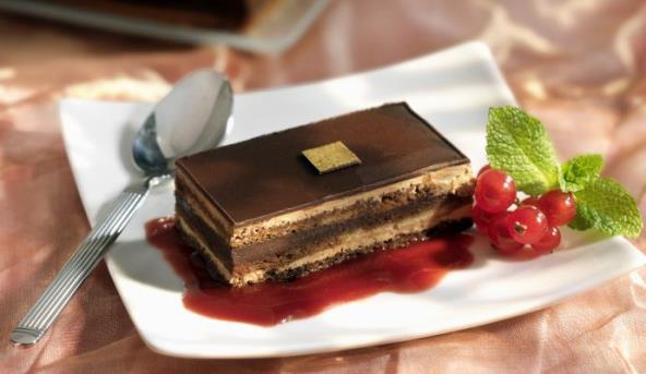 8. Biskvit iseći na pravougaone trake (veličine otprilike 20x10). Preko prvog biskvita staviti sirup od kafe i premazati polovinom krem fila. Preko staviti drugi biskvit, takođe preliti sirupom od kafe i naneti polovinu čokoladnog fila. Preko fila staviti treći biskvit natopiti kafom i naneti ostatak krem fila. Preostali čokoladni fil naneti kao poslednji sloj. Staviti tortu u frižider da se dobro ohladi.