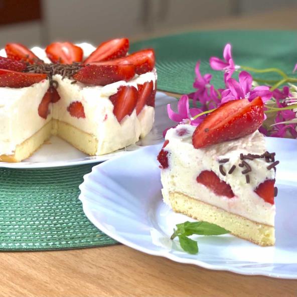 Za fil: Umutite žumanca sa šećerom, pa dodajte mleko. Kuvajte dok se ne zgusne smesa. U nju dodajte otopljenu belu čokoladu i aktivirani želatin. Lepo sjedinite. Po obodu kalupa ređajte jagode, pa sipajte fil. Po želji dodajte jagode i u sredinu fila. Ostavite da se hladi. Dekorišite po ukusu.
