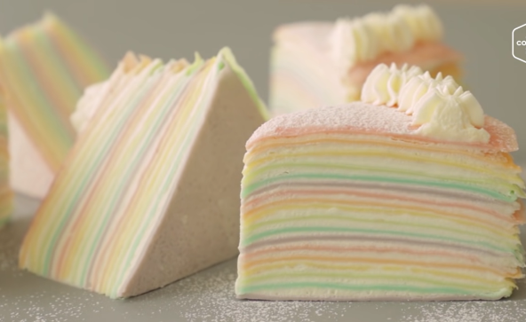 Sipajte smesu u 6 posuda i u svaku posudu stavite različitu boju. Lepo promešajte da se boje stope sa smesom. Ispecite palačinke.