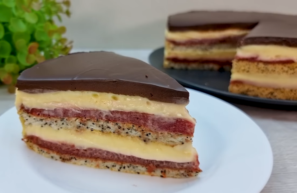 Odvojite žumanca i belanca. U žumanca dodajte šećer i skrob, dobro sjedinte, pa sipajte mleko i nastavite da mešate. Kuvajte uz konstantno mešanje dok se ne zgusne. Zatim dodajte puter i čokoladu, pa mešajte dok se ne otopi. Pokrijte i ostavite da se ohladi. Belanca umutite sa prstohvatom soli. Dodajte šećer i mutite dok ne dobijete čvrst šne. Dodajte skrob pomešan sa praškom za pecivo, promšeajte, pa dodajte mak. Sve lepo sjedinite. Kalup prečnika 22 cm prekrijte pek papirom, pa sipajte pola smese. Pecite na 180°C nekih 30 minuta. Na isti način ispecite i drugu koru od preostale smese. Voće pomešajte sa šećerom i vodom. Kuvajte dok se šećer ne otopi, pa štapnim mikserom napravite kašu. Dodajte kukuruzni skrob pomešan sa vodom, pa kuvajte dok se ne zgusne uz konstatno mešanje. Na obe kore premažite vrući fil od voća, pa ostavite da se ohladi. Sipajte beli fil, pa preko koru sa voćnim filom okrenutim na gore, a zatim opet beli fil. Otopite čokoladu sa slatkom pavlakom i stavite preko belog fila. Ohladite preko noći u frižideru.