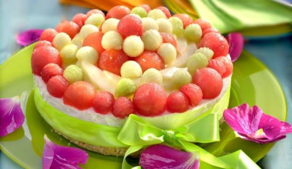 2. Prepolovite lubenicu, kašikom vadite kugle i poređajte po testu, a nekoliko ostavite za ukrašavanje.
