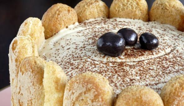 3. Izručiti želiranu masu na podlogu za kolače. Skratiti piškote tako da su duže za oko 3 cm u odnosu na debljinu želirane mase. Donje delove piškota poprskati viskijem i ređati uz želiranu masu po ivici. Umutiti pavlaku sa 30 g šećera i ukrasiti kolač, uz piškote. Posuti čokoladom i hladiti do služenja.