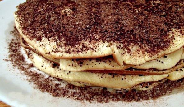 4. Palačinke ređeti jedna na drugu, i na svaku se stavi po 2 kašike smese za posipanje čim je gotova. Kada je gotovo, ceo desert izgleda kao torta, i tako se i seče.