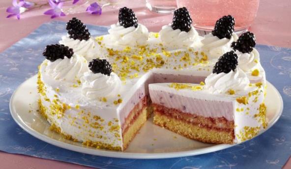 5. Za ukrašavanje umutiti 250 ml pavlake sa učvršćivačem, pa sa 2/3 šlaga premazati tortu. Ukrasiti kupinama i pistaćima.