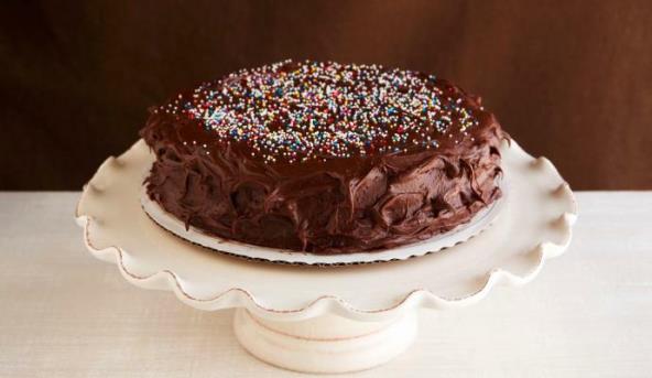6. Pre posluživanja pažljivo uklonite prsten, pa odozgo stavite tanjir i brzo prevrnite. Pažljivo skinite foliju i po potrebi izravnajte površinu. Ukrasite čokoladom ili pospite šarenim mrvicama.