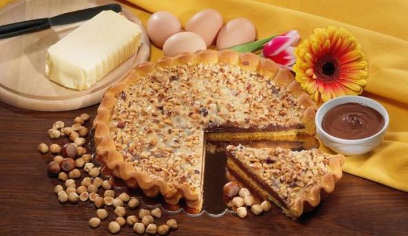 5. Sastojke za gornji sloj krupno sameljite u seckalici. Kolač pospite tom mešavinom.