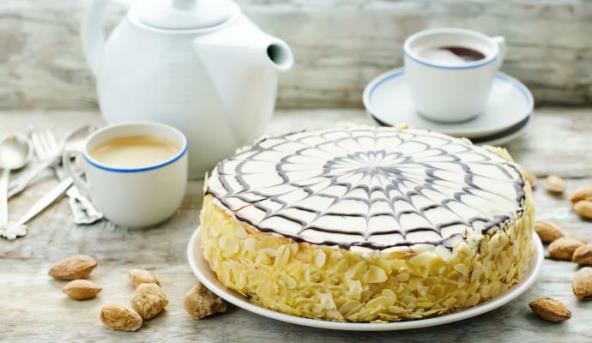 8. Karakterističnu čokoladnu šaru za esterhazi tortu napravite od otopljene čokolade i kašičice ulja, sipajte u plastičan fišek i šarajte linije ili krugove, pa štapićem za ražnjic ili tupom ivicom noža vucite linije pod uglom od 45 stepeni, jednu dole jednu gore.