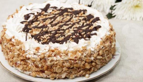5. Počnite sa slaganjem slojeva torte, na dno kalupa za tortu stavite trećinu mlevenog i usitnjenog kikirikija, preko tog sloja namažite trećinu pripremljene kreme, ponovno stavite sloj kikirikija i preko njega kašikom stavite trećinu rastopljene čokolade. Ponovno namažite krem, preko nje stavite tanki sloj čokolade, najbolje je šarati pomoću kašike, nastavite sa slojem krema potom posipajte preostalim kikirikijem i na kraju prošarajte s čokoladnom glazurom. Tortu možete ukrasiti umućenom slatkom pavlakom, kikirikijem i čokoladom.