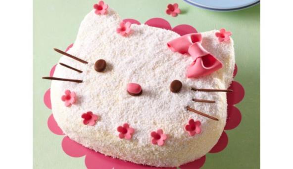 4. Kada se fil stegne, isecite tortu u obliku Hello Kitty. Premažite celu tortu ostatkom fila (bez malina) i pospite kokosom. Deo marcipana obojite kakaoom i napravite oči, nos i brkove, a deo obojite prehrambenom bojom i napravite cvetiće, nos i mašnicu.