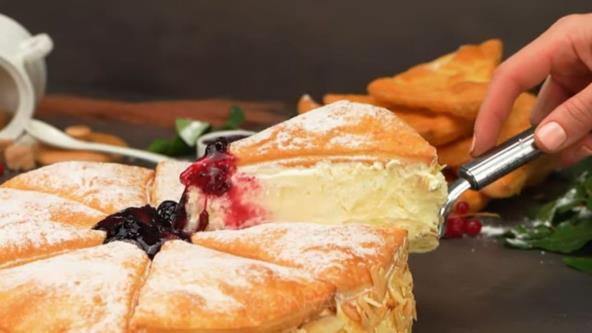 Pomoću velikog tanjira isecite lisnato testo u obliku kruga. Izbockajte čačkalicom, pa premažite vodom i stavite na pleh obložen pek papirom. Pecite na 180°C oko 20 minuta. Puding pomešajte sa 200 ml mleka i dobro promešajte da ne ostanu grudvice. Preostale mleko stavite da se kuva, pa kada se zagreje dodajte puding. Kuvajte dok se ne zgusne, uz neprestano mešanje. Sipajte u posudu, pokrijte providnom folijom i ostavite da se ohladi. Dok se fil hladi, uzmite lisnato testo i opet pomoću tanjira isecite krug. Podelite ga na 6 jednakih trouglova, pa poređajte sa razmakom na pleh obložen pek papirom. Premažite vodom i pecite na 180°C oko 20 minuta. Ohlađeni puding umutite, pa dodajte umućenu slatku pavlaku i sjedinite. Sipajte fil preko ispečenog lisntatog testa (u komadu). Preko poređajte trouglove od testa, a po ivici zalepite listiće badema. Stavite u frižder sat vremena, pa ukrasite džemom.