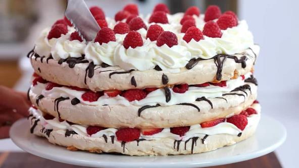 Počnite sa pripremom kore tako što ćete umiksati na maksimalnoj brzini belanca sobne temperature, šećer, so i tartar krem. Podelite ravnomerno smesu na tri kruga, a zatim ih na plehu obloženom pek papirom proširite i poravnajte nožem. Pecite u rerni na 90°C oko 6 sati. Na svaka dva sata rotirajte tepsije kako bi se ravnomerno isušile kore. Potom otopljenu šolju čokoladnih mrvica izlijte u probušenu kesu za zamrzivač i nanesite linije čokolade na sve tri kore. Umiksajte iseckane jagode, tečni šlag i šećer u prahu, dok ne dobijete gušći fil. Nanesite trećinu fila preko kore, pa poređajte maline i iseckane jagode ravnomerno, pokrijte drugom korom na ponovite postupak. Na kraju pokrijte trećom koru na korom pa dodajte preostalu trećinu šlaga i maline. Napravite sirup od izblendanih jagoda i šećera koji možete dodati na svako parče torte.