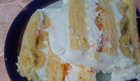 Prvu koru premazati sa 1/3 umućenog krema a odozgo poređati presečene banane. Zatim staviti 1/3 umućene slatke pavlake pa drugu ispečenu koru. Preko toga krema pa isečene breskve i 2/3 umućena pavlaka. Na kraju staviti i poslednju koru koju ćete premazati pavlakom i ukrasiti tortu po Vašoj želji