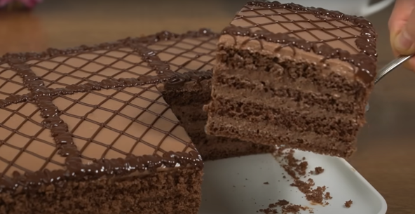 Prebacite otopljenu čokoladnu glazuru u kesu. Crtajte tanje pruge na torti čokoladom dijagonalno, prvo u jednom, a zatim u drugom pravcu. Takođe iscrtajte preko toga široke kvadrate. Uživajte! Možda ćete želeti da napravite i tortu monahinjina tajna.