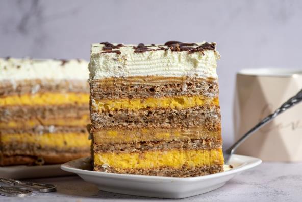 Kako biste napravili tortu, prvo napravite kore. Umutite za svaku koru 6 belanaca, 6 kašika šećera, kao i 6 kašika mlevenih lešnika i 6 kašika mlevenog keksa, kao i 1/2 kašičice praška za pecivo. Smesu rasporedite u pleh i pecite na 150 stepeni 40 minuta, pa nakon toga ispecite i preostale 2 kore.