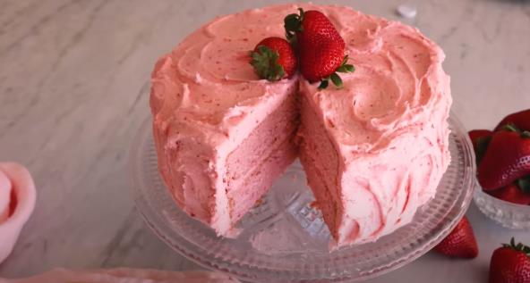 Dodajte belanca i vanilin ekstrakt. Mutite na srednjoj brzini oko 1 minut ili dok se dobro ne sjedini i ne postane mekano. Smanjite brzinu na nisku. Dodajte mešavinu brašna naizmenično sa mlekom i pireom od jagoda, mešajući samo dok se ne sjedini. Po želji umešajte kap ili dve ružičaste boje za hranu. Podeliti testo između dva kalupa za torte. Pecite 30 minuta, pa ostavite da se ohladi u kalupu 20 minuta. Izvadite i ostavite da se potpuno ohladi na rešetki.