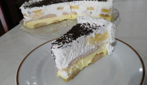 3. Obruč za pečenje torte staviti na poslužavnik pa u njega poređati prvo pakovanje piškota koje ste umočili u sok od ananasa.Njih premazati žutim kremom. Zatim drugo pakovanje piškota. Na njih staviti prvi deo bele kreme, pa poređati ananas, pa drugi deo bele kreme. Odozgo staviti umućen šlag (pena). Dekorisati po želji.