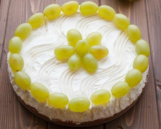 4. Tortu držite u frižideru barem 2 sata pre služenja. Skinite obruč i ukrasite ostatkom bobica grožđa.
