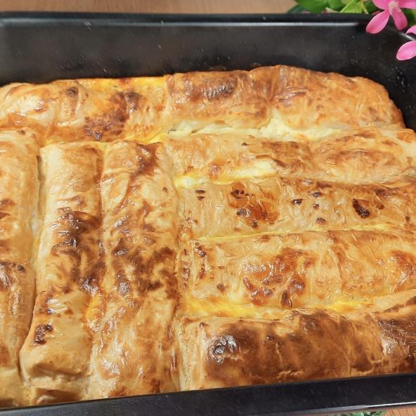 Sir usitnite, pa dodajte jaja i sjedinite. Kiselu vodu, ulje, sodu bikarbonu i so pomešajte, a zatim uzmite jednu koru i premažite ovo smesom. Preklopite koru i opet premažite, pa okrenite uspravno. Na vrh stavite fil, malo savijte kore sa strane i onda urolajte. Ređajte u nauljen pleh. Umutite jaja dobro, pa dodajte ostale sastojke za preliv i sipajte preko pita. Pecite u zagrejanoj rerni na 180°C 25-30minuta. Prekrijte je folijom, pa krpom i ostavite 10-ak minuta.