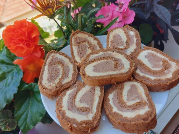 Maslac umutiti sa prah šećerom i izmešati sa skuvanom kremom. Dodavati kremu polako u maslaac. Mutiti mikser na lagano. Podeliti fil na dva dela. U jednu dodato rastopljenu čokoladu ili kakao pa izjednačiti.. Biskvit odviti iz krpe, raširiti, pa ga prvo premazati sa svetlim kremom pa preko njega čokoladnom. Uviti ponovo rolat pa u foliju i ohladiti 2-3 sata u frižideru. Seći i sladiti se.