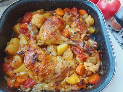 Luk isecite na rebra i propržite na ulju. Dodajte isečenu šargarepu i papriku na kolutove.Izdinstajte, pa dodajte krompir na kocke. Ubacite karfiol i paradajz isečen na kocke. Ako želite možete da dodate glavice mladog luka i čenove belog. Meso posolite, pa utrljajte začin za piletinu. Premažite uljem i ušuškajte meso u povrće. Pecite na 220°C oko sat vremena. Možete da pokrijte folijom prvih 20 minuta, pa otkrijte i pecite da porumeni.