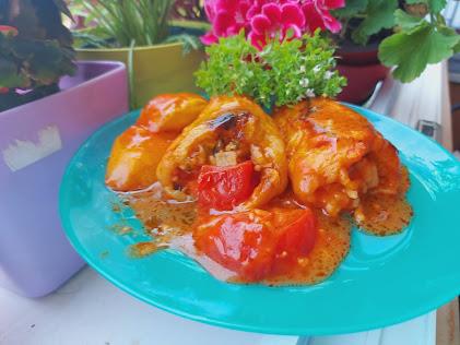 Ređati u podmazan pleh. Izmešati paradajz vodu i dodati brašnio. Izjednačiti. Sve sipati preko paprika i preliti malo uljem. Peći na 220 stepeni oko sat vremena.