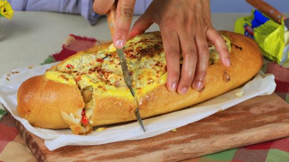 Izdubite hleb, pa tu sredinu iskidajte ili iseckajte, umešajte u fil od povrća. Nafilujte veknu, prelijte prelivom od jaja i mirelama ili pavlake. Sve umotajte u foliju, pa pecite u već zagrejanoj rerni na 220°C oko 20 minuta. Pečeno premažite dok je toplo maslacem.