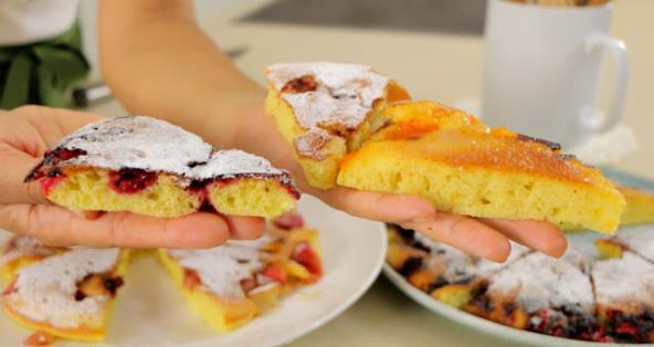 Umutite jaja sa šećerom i vanil šećerom, dodajte mleko, ulje, so, brašno, prašak za pecivo, limunovu koricu. Iseckajte voće. Tiganj zagrejte namažite maslacem, stavite voće (možete samo jednu vrstu ili mešano), jedan deo testa, poklopite i pecite na srednjoj temperaturi oko 15 minuta. Preokrenite na tanjir, pospite šećerom u prahu, isecite i uživajte u odličnim kolačima. Postupak ponavljajte do utroška testa i voća. Prijatno!