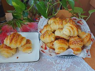 Kašičicom vaditi i puniti trouglove i uvijati u kiflu. Ostaviti u plehu 30 min pokrivene, premazati žumancetom i posuti susamom pa peći na 200 stepeni 30 min. a zatim pokriti krpom 15 min .