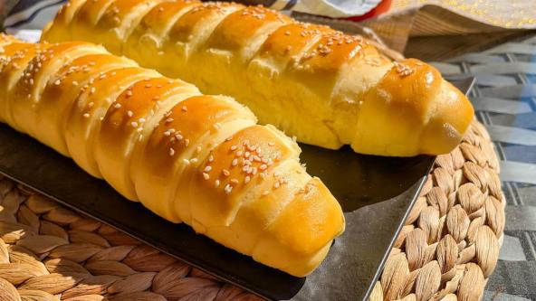 Pleh obložite papirom za pečenje (ili premažite sa uljem) pa preko stavite štapiće. Premažite testo sa umućenim jajetom sa kiselom pavlakom i pospite sa susamom. Pecite u zagrejanoj rerni na 200 C dok ne porumene (oko 25-30 minuta).