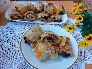 Jabuke izrendati, šljive držati u vrućoj vodi oko 20 min. U rendane jabuke dodati suvo groždje i malo cimeta. Prvu koru raširiti na sto poprskati uljem pa staviti još jednu preko nje. Pobacati mešavinu rendanih jabuka a pri dnu poređati suve šljive, koje su omekšale. Saviti ivice i uviti u rolat. Ređati u podmazan pleh. Zaseći na manje rolnice, sve premazati uljem i peći na 200 stepeni oko 35-40 min.