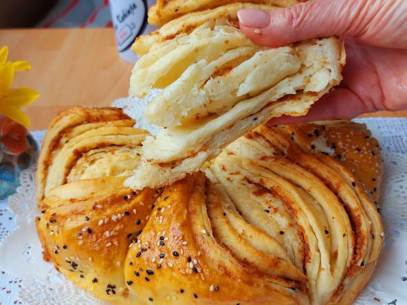 Saviti sa jedne i druge strane i sa suprotne strane, testo pretvoriti u kocku i zaseći nožem na 8 uglova.. Pokriti da odmori pa premazati žumancetom i posuti susamom. Peći na 180 stepeni 45-50 min.