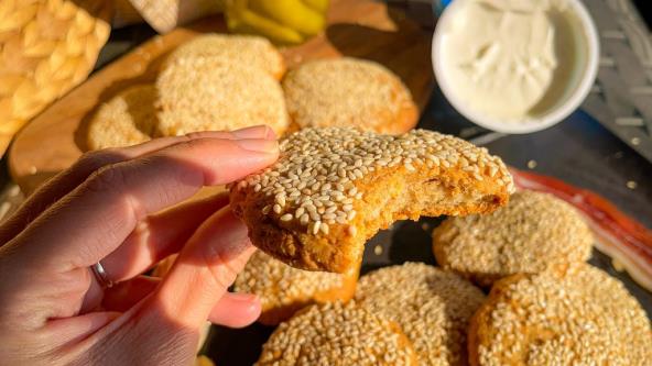 Dodajte jaje, ulje i jogurt, pa sve sastojke dobro promešajte. Dobićete lepljivu smesu. Rukama oblikujte 12 loptica, spljoštite ih i uvaljajte gornju stranu u susam. Poređajte testo na pekač od rerne na koji ste stavili papir za pečenje ili koji ste predhodno nauljili.