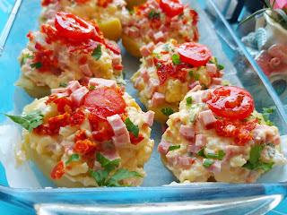 Skuvati krompir u ljusci ali ne sasvim da se prekuva, skinuti ljusku pa preseći na pola. Izdubiti sredini u jednu činiju. Šunku iseći na kockice, kao i sir. Jaja izmutiti malo žicom, dodati izdubljen krompir iseckanu šunku i sir, izdrobljen beli luk, peršunov list . Ubaciti i kiselu pavlaku i rendan kačkavalj i sve zajedno izjednačiti. Kašikom puniti krompir rasporediti masu.