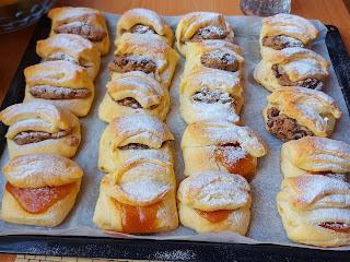 Orahe mlevene i plazmu izmešati pa preliti sa vrućim mlekom u koji ste stavili šećer i suvo groždje. Sve izjednačiti. Testo premazati maslacem pa ga par puta preklapati i premazati kao za salčiće. Razviti na pola cm pa iseći na kvadratiće. U svaki staviti kašičicu mlevenih oraha i preklopiti. Malo ostaviti za džem po želji. Poklopiti folijom i krpom pa odmoriti 15 min.
