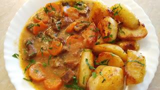 Iseckati sitno crni luk i propržiti na ulju, dodati seckanu šargarepu pa i nju propržiti, dodati lovorov list, meso, malo sipati vode. Iseckati ruzmarin i majčinu dušicu, pa i nju dodati kao i zelenu papriku, i sve dinstati na malo vode oko sat vremena da meso omekša. Sipati vino i ostaviti 5-6 min da vri.